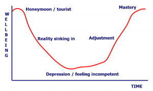 Usually this up-beat mood doesn’t last. Reality starts to sink in. You start to miss your family and friends more and more. Getting meaningfully connected with people in the new host culture often proves more difficult than expected, as the ‘rules of the local social game’ are often hidden below the surface, and difficult to grasp. The local do’s and don’ts are not always easy to incorporate (if you recognize them for what they are at all). You may miss the food, the habits and rituals from home, and so on.